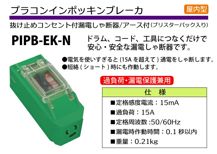 日動工業 プラコンインポッキンブレーカ 抜け止めコンセント付 漏電しゃ断器 アース付 過負荷・漏電保護兼用 屋内型 PIPB-EK-N