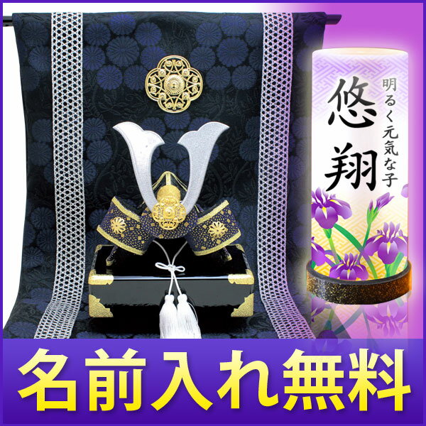 【簡易人形ケース】入りの五月飾りセット金襴地の上品な兜に、家紋入りの屏風・長持・三宝ちまき・ショウブの花・名入れキャンドルがコンパクトかつ豪華に納まりました!「兜飾りに合う家紋入りの屏風が欲しい!」というお客様のご希望にお応えいたしました。