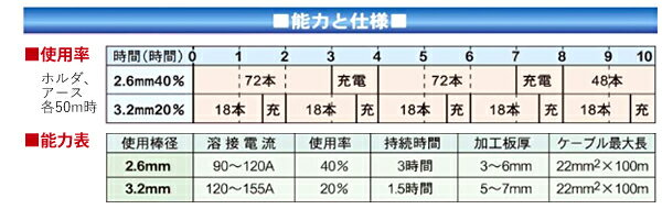※バッテリーの寿命は約1年半〜2年半(ただし使用頻度や保管状態により異なります) 製品仕様 ●出力調整:電子制御式無段階調整 ●定格出力:150A ●定格使用率:20〜40% ●使用溶接棒:2.6、3.2mm ●入力周波数:50/60Hz ●入力電圧:100V ●定格入力:1.5KVA ●冷却方式:強制空冷 ●バッテリー型式:TYPE-Z ●バッテリー個数:1本 ●バッテリー接続方式:直列 ●バッテリー容量:36V 20Ah ●寸法:W340mm×H530mm×D240mm ●本体重量:上部22kg、下部35kg ●総重量:57kg 製品仕様一覧 型式 定格出力 定格使用率 使用溶接棒 入力周波数 入力電圧 定格入力 バッテリー型式 寸法 総重量 BW-155BXR 150A 20〜40% 2.6、3.2mm 50/60Hz 100V 1.5KVA TYPE-Z W340mm×H530mm×D240mm 57kg BW-170ZR4 170A 20% 1.6mm〜3.2mm P1220J W390mm×H385mm×D255mm 37.8kg BW-145ZR3 170A 20% 1.6mm〜2.6mm(3.2点付) XY1214 W390mm×H385mm×D255mm 約31kg